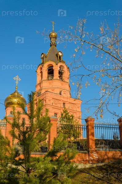 Церковь на фоне голубого неба и деревьев