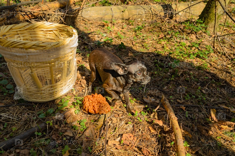 Грибы сморчки и маленькая черная собака