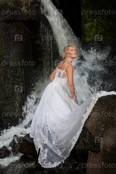 Блондинка в белом платье возле водопада