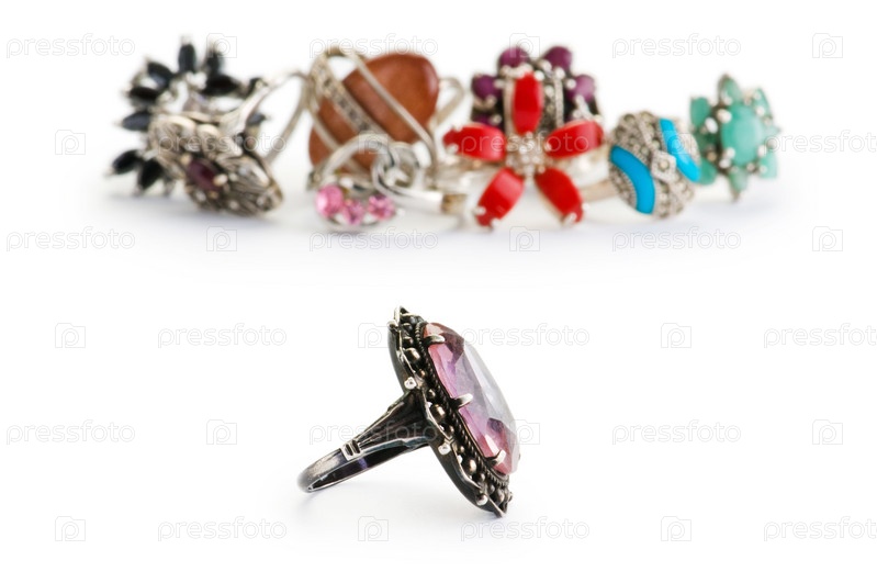 Несколько колец с камнями, изолированные на белом фоне