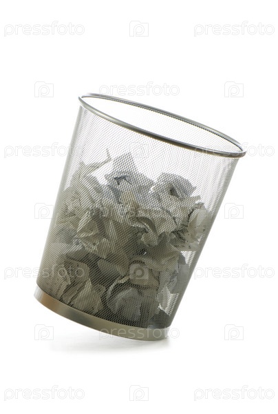 Ведро с мятыми бумажками на белом фоне