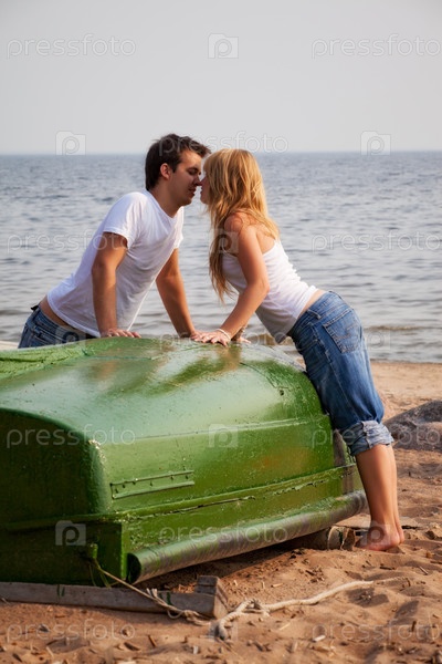 Целующаяся пара на пляже возле старого баркаса