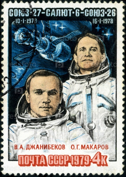 Марка СССР 1978 года. Знаменитые русские космонавты Джанибеков и Макаров. Серия Союз-27, Салют-4, Союз-27