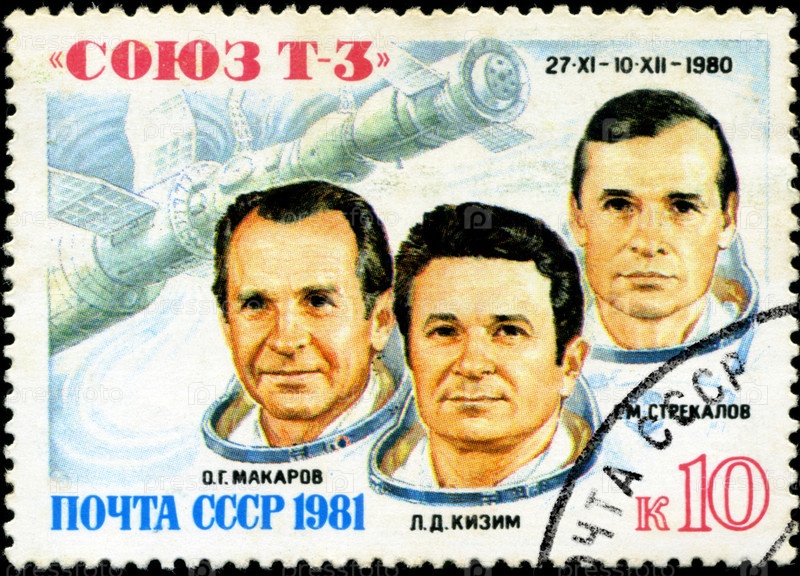 Советские космонавты Макаров, Кизим, Стрекалов и транспортный космический корабль Союз-Т3