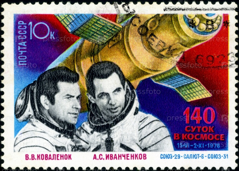 Марка СССР 1978 года. Космонавты Коваленок и Иванченков, Салют-6, Союз