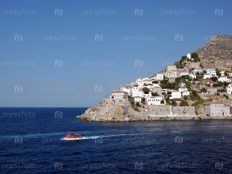 Катер выходит в Эгейское море из порта острова Гидра, Греция