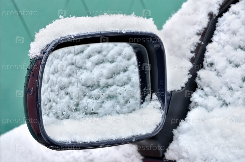 Автомобильное зеркало, покрытое снегом