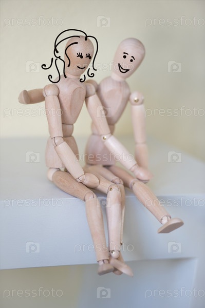 Деревянные люди сидят у себя дома и обнимаются. Концепция отношений. Рисованные лица