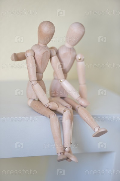 Деревянные люди сидят у себя дома и обнимаются. Концепция отношений
