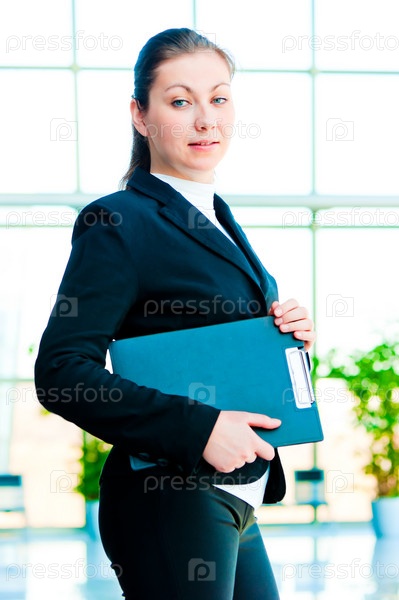 Улыбающаяся девушка-менеджер с папками