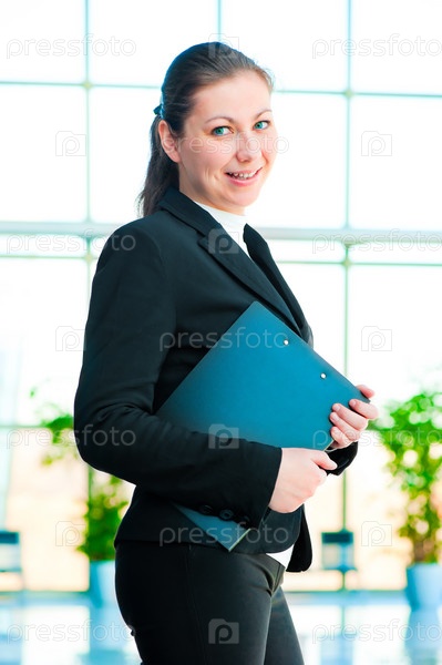 Улыбающаяся девушка-менеджер с папками