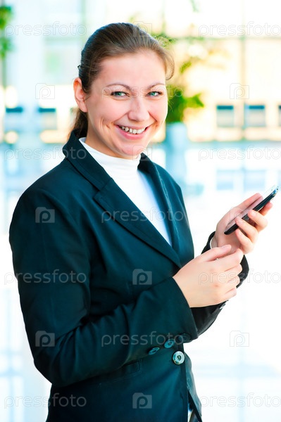 Счастливая бизнес-леди с мобильным телефоном в руке