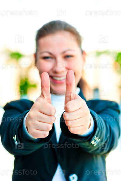 Молодая счастливая бизнес-леди показывает, что все будет хорошо