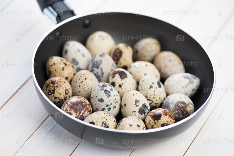 Сырые перепелиные яйца в сковороде, крупный план