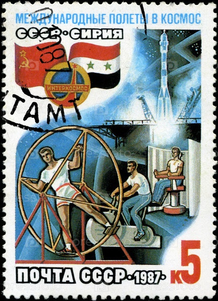 Почтовая марка СССР 1987 года, международные советско-сирийские космические полеты