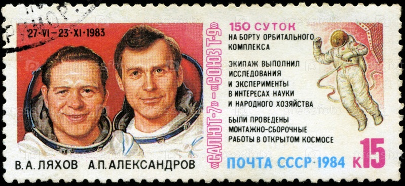 Почтовая марка СССР 1984 года, комплекс Салют-7 и Союз Т-9, портреты космонавтов В.А. Ляхова и В.А. Кириллина, 150-дневный полет в космос