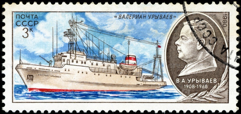 Почтовая марка СССР 1980 года, портрет ученого и корабль с надписью «Валериан Андреевич» из серии «Советских научных исследований кораблей»