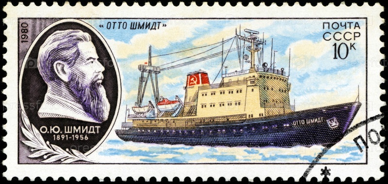 Почтовая марка СССР 1980 года, портрет ученого и корабль с надписью «Отто Шмидт», из серии «Советских научных исследований кораблей"