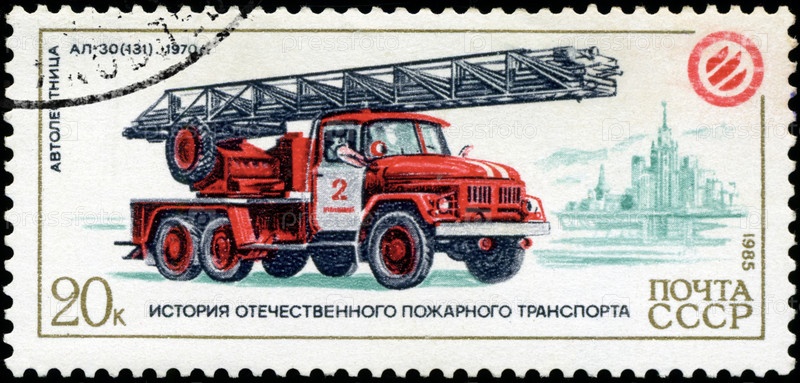 Почтовая марка СССР 1985 года, пожарная машина