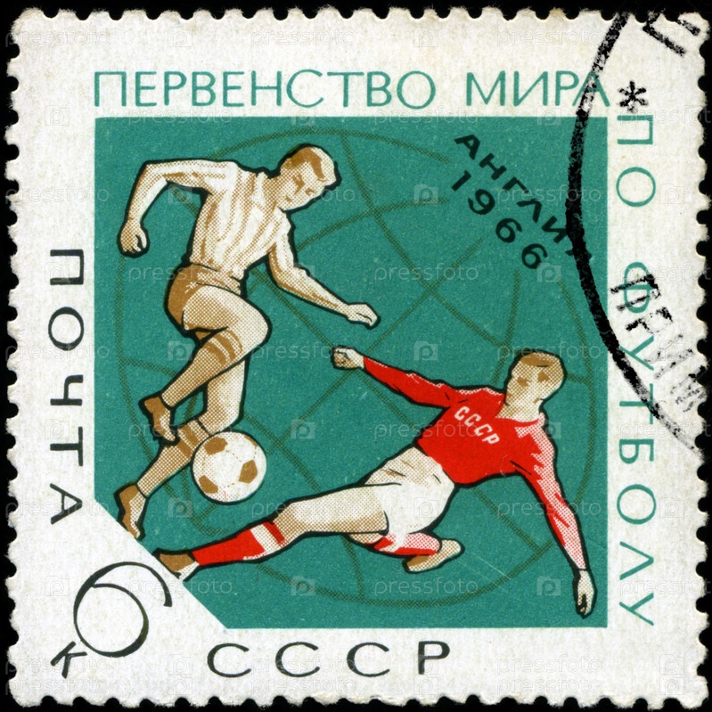 Марка СССР 1966 года, футболисты с надписью и название серии «Кубок мира по футболу, Англия, 1966»