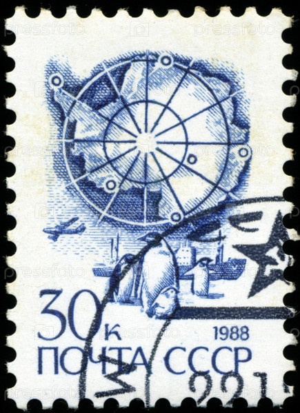 Марка СССР 1988 года, корабль и пингвин