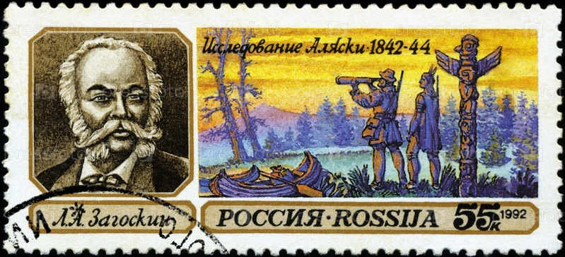 Российская марка 1992 года. Портрет Загоскина и река Юкон с надписью «Загоскин, исследование Аляски 1842-44», из серии "Экспедиции"