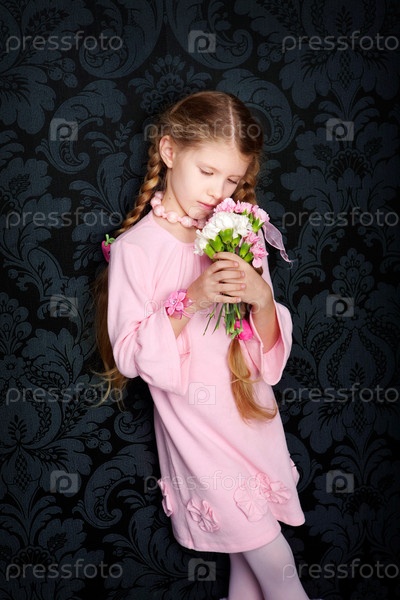 Маленькая девочка в розовом платье с букетом