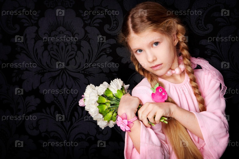 Маленькая девочка в розовом платье с букетом крупным планом