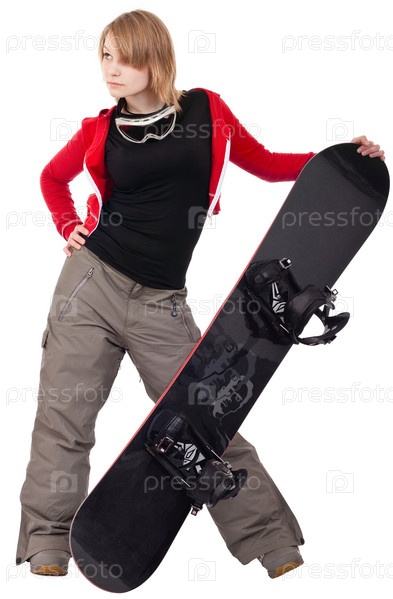 Портрет стильной молодой девушки со сноубордом на белом фоне