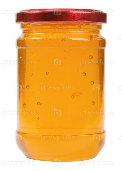 Закрытая стеклянная банка с медом на белом фоне