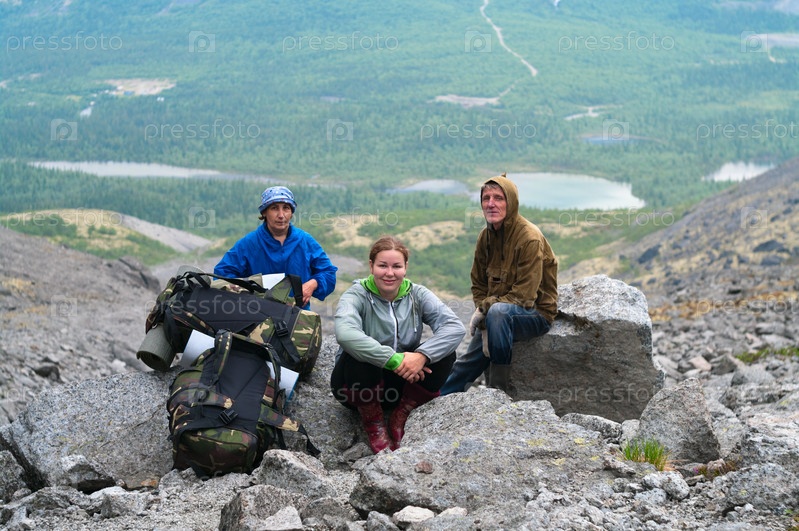 Три туриста в горах, вид сверху