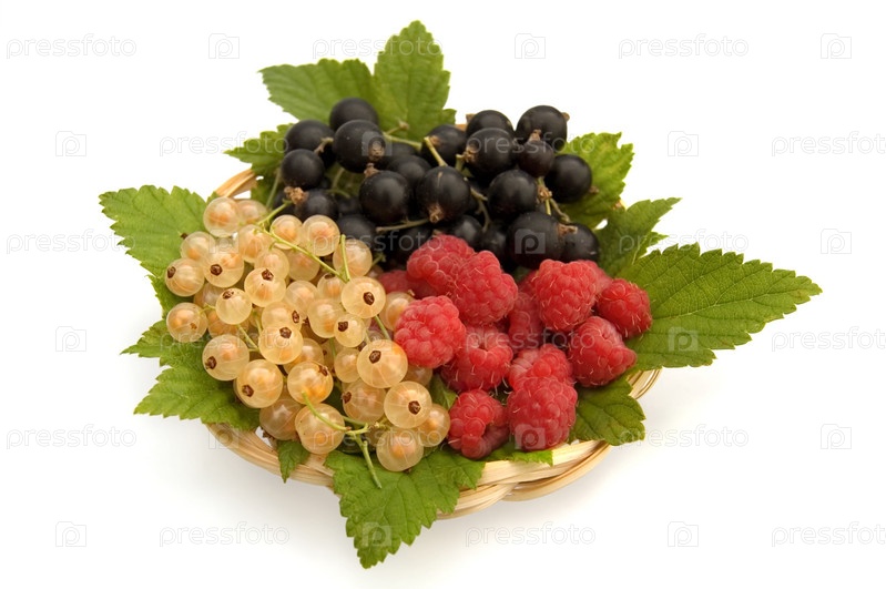 Ягоды малины, белой и черной смородины в тарелке на белом фоне