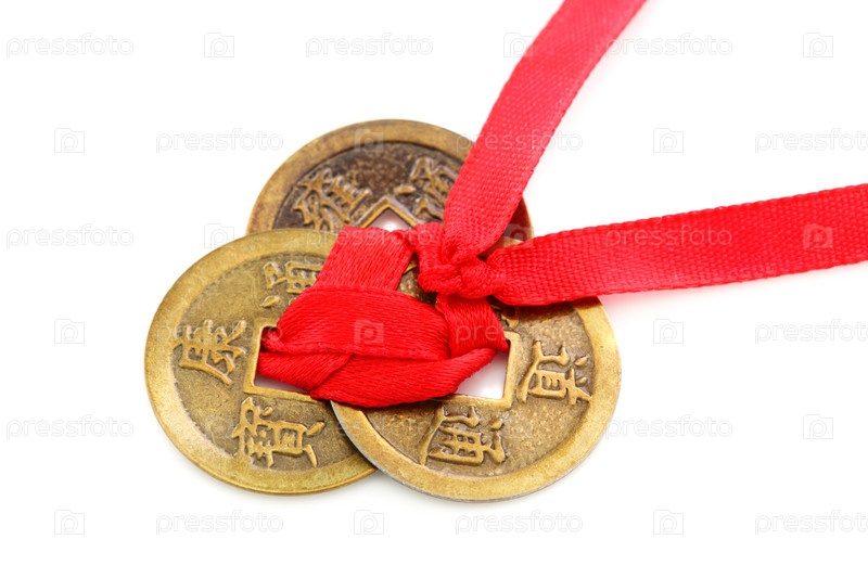 Три китайские монеты с красной лентой