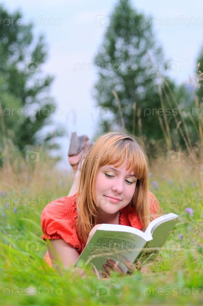 Молодая женщина читает книгу, лежа на траве