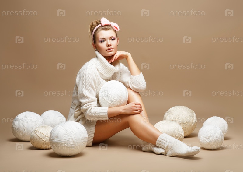 Вязание спицами. Швея. Женщина в белой вязаной одежде с пушистыми клубками пряжи