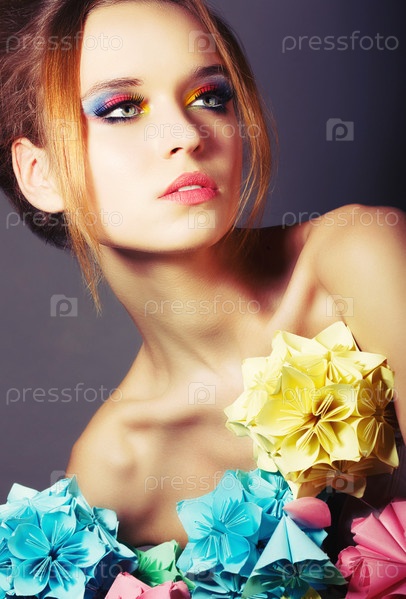 Портрет молодой красивой женщины с красочными цветами оригами. Яркий макияж глаз