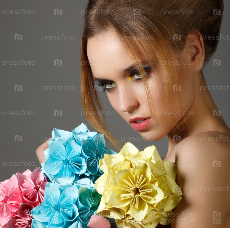 Красивая яркая женщина, держащая букет бумажных цветов