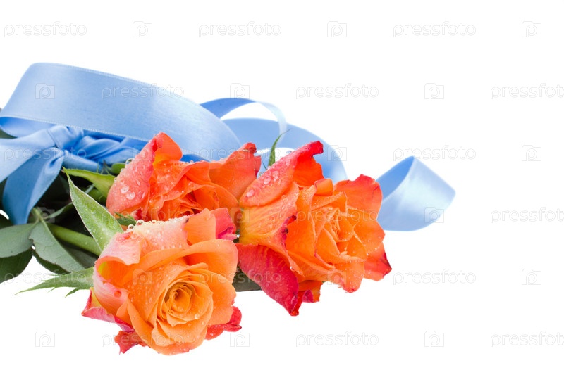 Три оранжевые розы с голубой лентой