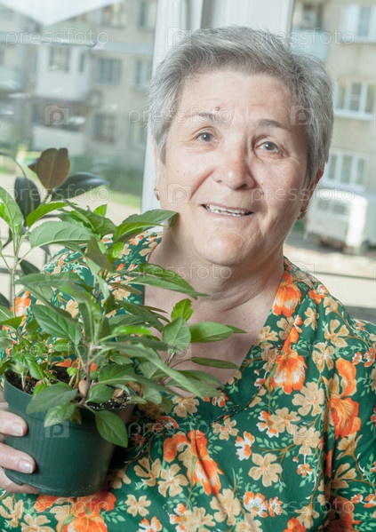 Пожилая женщина с комнатным растением