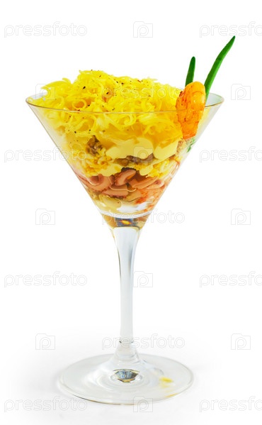 Салат из макарон, креветок и лука, изолированный на белом фоне