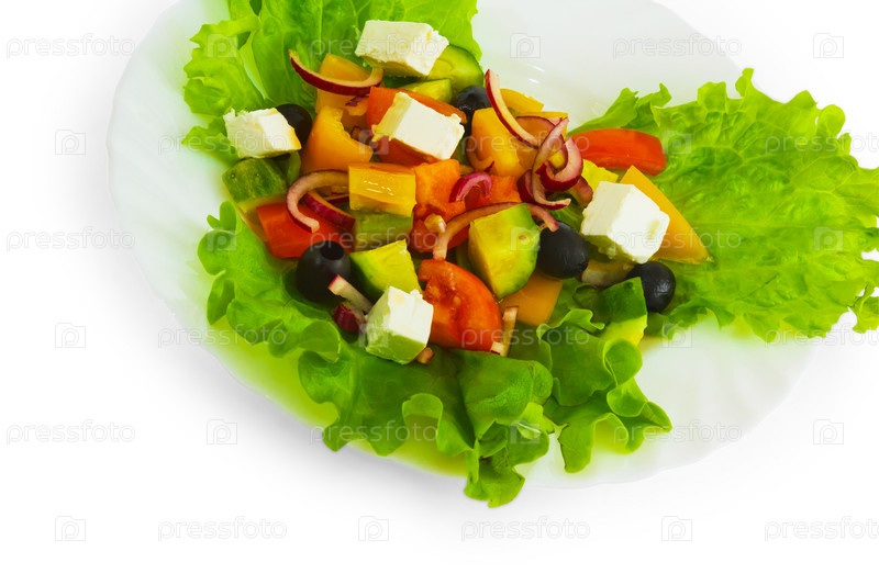 Салат с сыром, огурцом, помидором и листом салата, изолированный на белом фоне