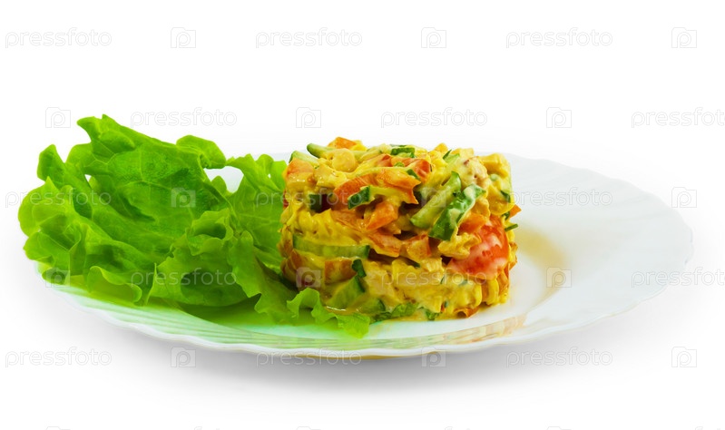 Салат с помидорами, огурцами, майонезом и яблоком, изолированный на белом фоне