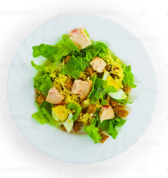 Салат с хлебом, сыром и колбасой, изолированный на белом фоне