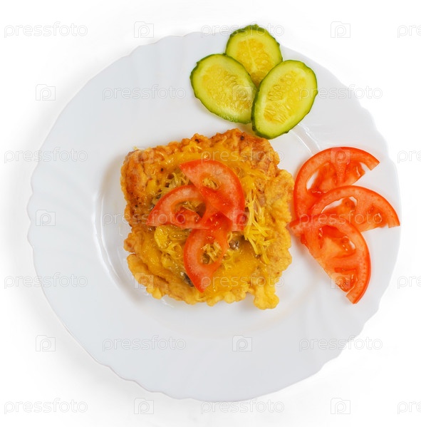 Стейк с сыром и огурцом на тарелке, изолированный на белом фоне