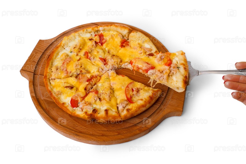 Аппетитная пицца с сыром на деревянном подносе крупным планом на белом фоне
