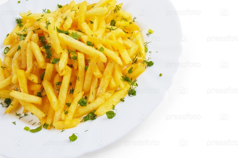 Вкусный картофель фри с укропом, изолированный на белом фоне