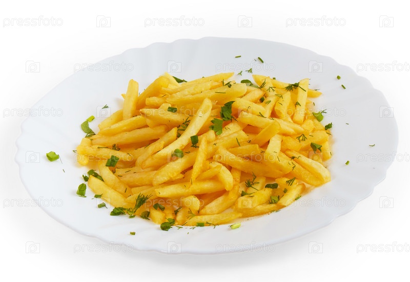 Вкусный картофель фри с укропом, изолированный на белом фоне