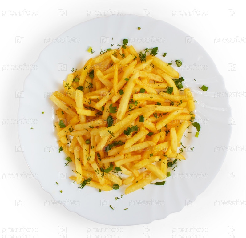 Вкусный картофель фри с укропом, изолированный на белом фоне