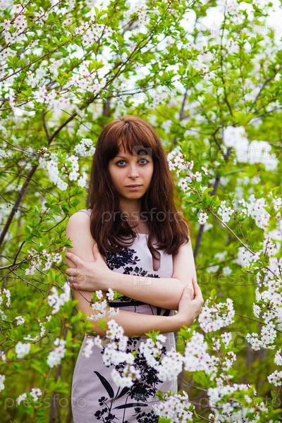 Темноволосая девушка стоит среди цветущих деревьев, глядя в камеру