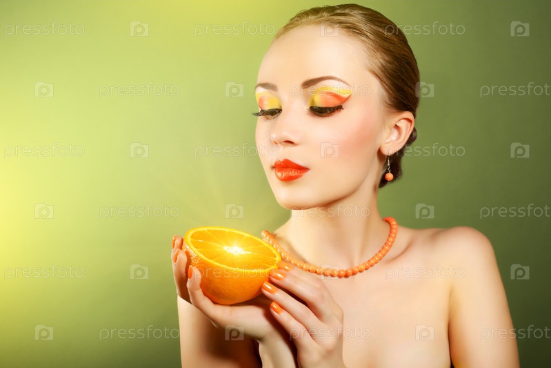 Девушка с красивым макияжем держит апельсин
